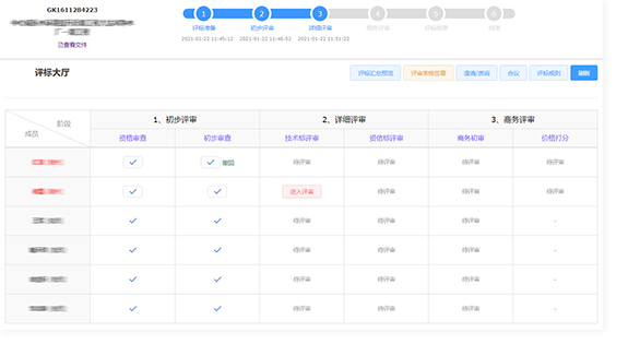 針對(duì)投標(biāo)人逐個(gè)進(jìn)行評(píng)審,單個(gè)保存結(jié)果,全部評(píng)審?fù)瓿珊筮M(jìn)入下一階段。