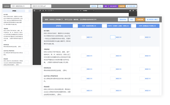 一次性多所有投標(biāo)人進(jìn)行評(píng)審,每個(gè)評(píng)審項(xiàng)分別對(duì)應(yīng)響應(yīng)文件,點(diǎn)擊即可定位查看相應(yīng)文件。