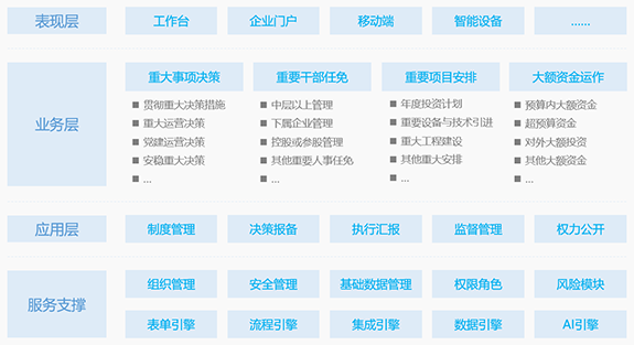 包括“三重一大”事項(xiàng)管理、決策支持、監(jiān)察匯報(bào)。通過對(duì)流程管控、多級(jí)監(jiān)控、信息打通和自動(dòng)監(jiān)管,來實(shí)現(xiàn)“三重一大”制度的落地,以及一些常見問題的解決,是央企、國企三重一大決策的有力支撐。