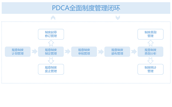 遵循“PDCA”全面質(zhì)量管理管理理念,對(duì)規(guī)章制度全生命周期各環(huán)節(jié)管理,實(shí)現(xiàn)數(shù)據(jù)共享、信息存儲(chǔ)、文件審批等功能,持續(xù)改進(jìn)制度的質(zhì)量。